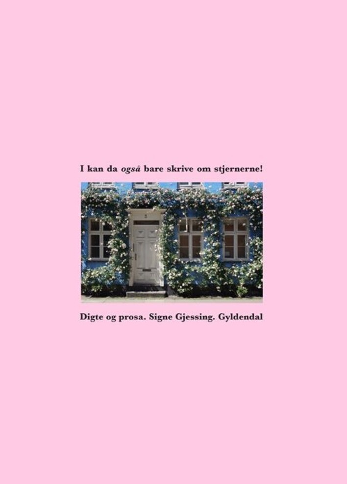 I kan da også bare skrive om stjernerne! er digte og prosa, der bevæger sig fra passionen til paradis, fra bevidstløshedens mørke til salighedens stjernehav. Med skønhed og humor skriver Signe Gjessing om ubegribelige realiteter, om rosernes blomstring, om det nødstedte menneskes vanskelighed ved at blive reddet og om star-crossed lovers i et lidt forvirret verdensalt.