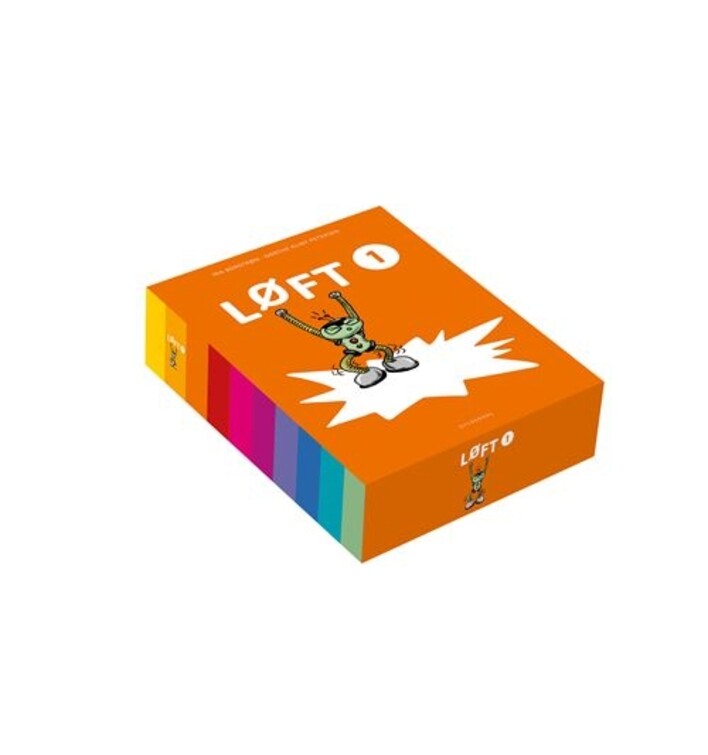 LØFT 1. Kasse indeholder 216 brikker og kort til at understøtte materialets aktiviteter i holdundervisningen. Der er bogstavbrikker, ordkort, billedbrikker, bankoplader, mundkort og meget mere – oversigten i kassens låg giver overblik over de mange elementer, som ligger i særskilte rum i kassen lige til at finde frem til ugens undervisning.
