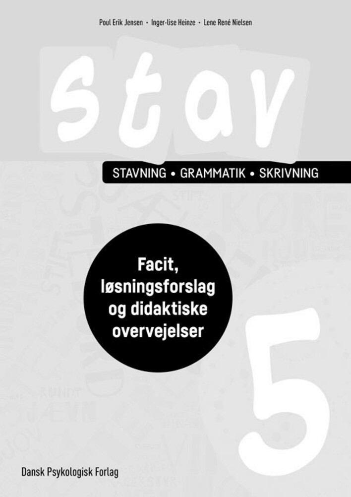 Lærerens facitbog til STAV 5 indeholder side for side-facitliste, forslag til løsninger af opgaver, staveregler samt didaktiske overvejelser.